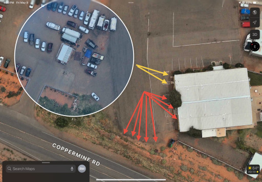 Elks 2498 Page, Az. There are 10 spots, 2 x 50amp (yellow arrows) and 8 x 30amp (red arrows). They all have a water spigot at each site. The sites are VERY TIGHT. with my slides out I am line to line. I think for all of them to be in use they would have to be parked just right. If you come in on Fridays, come before 4 as they have Bingo and the parking lot fills up.