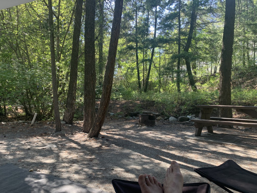Between the Hwy & Lake. For smaller rigs. Some small level back-in sites. Some slightly larger pull-a-long sites. Some with stairs down to waters edge. Pit toilets. Hwy traffic quieter at night. Spectacular views of rock bluffs.
