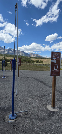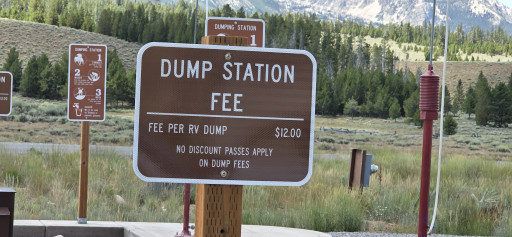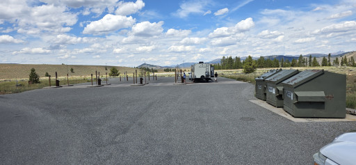 4 lanes. Rinse hose and separate potable water hose. We tried 2 of the potable water hoses and both leaked from the top of the boom, so you get to take another shower while filling your rig 😂. Dumpsters for your trash. No waiting when we were there. $12, now, to dump, NO discount for senior pass. Easy in and out.