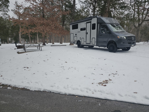 We had the park to ourselves. Chose a spot that had an easy bank to pass and we were set. No water or showers at this time of year. Perfect for a 1 night pass thru south. 5 inches of hard pack snow.