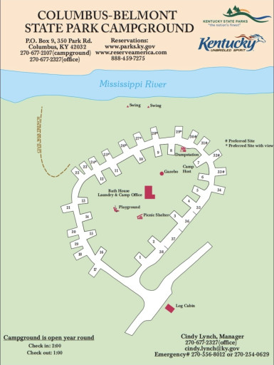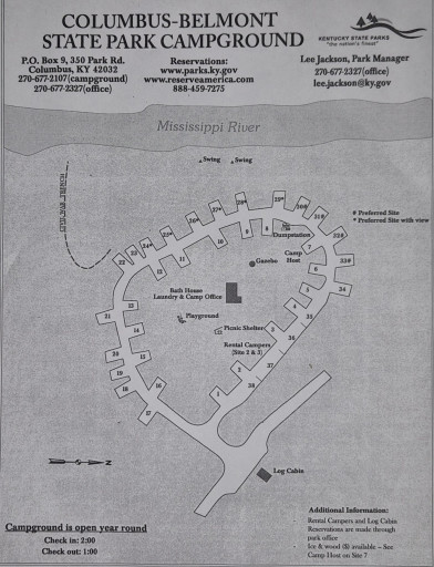 We stayed at Columbus-Belmont State Park in Kentucky over the Labor day weekend. I want to let everyone know, although it was a small park. Campground has 38 spots. 30 & 50 Amp, water and sewer is available. It was a very nice park with a lot of Kentucky Civil War history.