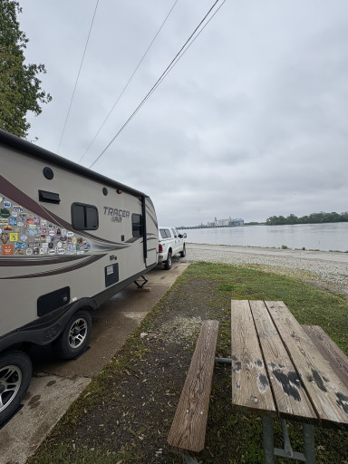 You will be as close as you could possibly be to the river. City campground with Twenty three total sites seventeen are full hookups rest are water and electric sites on level concrete pads 20/30/50 amp electric ours worked as they should. NO restrooms or laundry but dump station and dumpster are available along with decent WiFi. Playground for the kids. You are just a few hundred yards away from the lock and dam great to view any barge traffic coming by. Train tracks are just a few hundred feet behind the campground haven’t seen any trains yet but they will be loud. Call phone number make reservations or on the website go to top right corner click on camping options to book on line. I gave this park 5 stars not because it has everything but if you are here it’s because you want to see river traffic and you can’t get any closer than this.