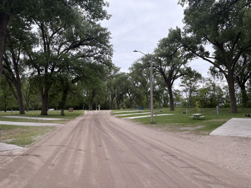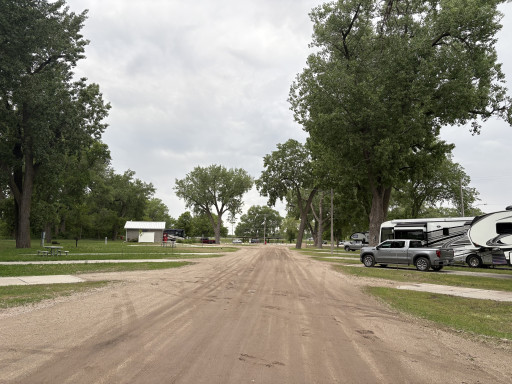 This is a city park. All the RV sites are just power. If you are a big rig, stay to the left of the campground sign as the right side has low hanging limbs. All of the spots have concrete pads, not level and a little narrow in my opinion. The campground is surrounded by cottonwood trees, so it’s like you are in a snow globe. Watch you A/C condensers on warm to hot days. The ground is crap grass with bald spots and lots of ant hills. There is a host and he was very friendly. They now have a QRE to pay for spots, it’s buggy and I could not get it to work. It forces you to open an account but then won’t let me open an account. This started about a week ago. I have been playing phone tag with the person in charge of the park and recs campground.