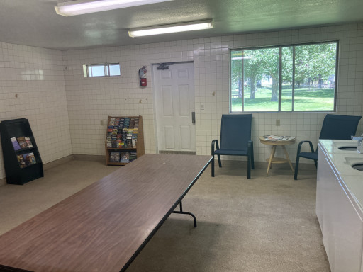 Almost in downtown Evanston, WY. It's decent enough even if it's not our type of camping. It has a nice, fairly clean laundromat…6 regular top load machines @ $2 a load and 3 dryers @ $.25 for 8 minutes. I say fairly clean because we had to wipe dust off the folding table and there was gritty sand/dust in the bottom of a couple of washers. The dryers worked well. Our drive-thru space is a somewhat lumpy grass pad. It took a little jockeying to get it level but we did it without resorting to pads and blocks. Lots of traffic noise so if that bothers you this is not the place. No pool but full hookups, free but weak wifi, good cell service on AT&T. We didn't use the showers or restrooms. Roadways are dirt/gravel, restaurants within a short walk. Rodeo just up the street. $33/night.