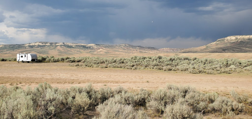 FREE, dispersed campsite on the hill top. Great 360° view. Huge open space that will fit several rigs. Road in from Fossil Butte Rd, .4 mi, was very narrow, steep and rocky. We tow 35' tt and have to put 4x4 just to be safe. Once you make it to the top, you will be rewarded with great views. Unobstructed view of sky for Starlink. This place is perfect if you depending on solar to keep your bateries charged.