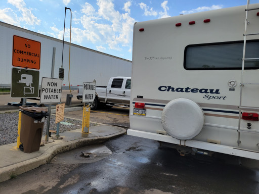 Easy free dump. Potable and non-potable water. Left side of building by tire center.