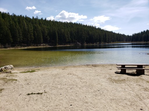A nice drive from Golden, until the 2km gravel road, which is narrow and potholed. 22 sites, nicely spaced but some quite sloping. Vault toilet, firepits and tables are the only services. Day use area is in campground, with a nice pier and lake access. Boat ramp is further along road. Lots of mosquitoes, but pleasant enough.