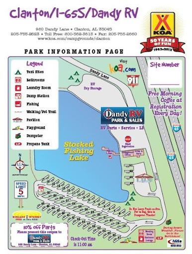 Stayed for one night and had all we need it, which is full hookups. Close to Montgomery and about an hour to Birmingham. Our spot was in the back so not as much noise as I expected, the sites are kinda level but it's a little hilly around, they have picnic tables, playground and a lake for catch and release. Bathrooms/showers appeared clean, also looked remodeled. Laundry was a little expensive for me ($2 each) but are brand new machines and you can even iron your clothes there (1st time I see it in a campground)