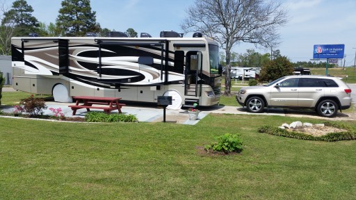 This is a NICE park! Spaces are a little short for our 44' coach & toad. But they work after unhooking. Interior roads paved, spaces all concrete & pretty level. No trees to scratch the coach (BIG deal for us!) It's a great stop. VERY well maintained. We went into town for dinner, (10 min drive). Would definitely stop here again. Y'all did a great job planning this park!