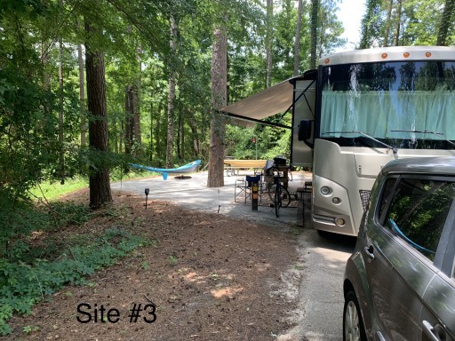 We stayed on site #3 for 3 nights during the week in a 30ft class A, so very peaceful. Our site was very level, lots of privacy. You can see the water from this site but through the trees. If you have the Golden Age card you pay 1/2 price. Really beautiful beach here too. If you want to be close you want Lake View Loop. There are sewer sites at this Army Corp….58 & 59 and 65 - 77. It would be great if you were staying the 14 days. There are some nice pull through sites in Pirates Cove. I liked 39 or 40. Did not go in the bath houses, but heard a few people say they were very nice. We will definitely be back.