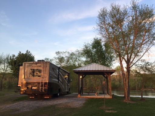 We’re new RVers and this was the second RV resort we stayed at. This is about 6 miles off the main Hwy. We have a 37’ ft Class A and had a lot right along the river which had beautiful views. Lots are a nice size and very clean. There is a little walking path around the river where we walked our dog. Wish we could have stayed another night or two.