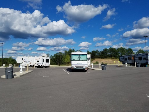 Parking for rvs next to stadium. NO SHOWERS OR REST ROOMS.Full hookups. Nice level pull thrus. Clean. Made for overnight stop, not a vacation place. Good stop for self contained one nighters.