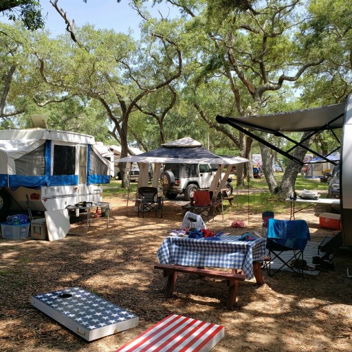 We live next door to this KOA. They have new owners and it is really nice! Camp store, waterfront, pool, kayak rentals, and shade! And a pizza place! They also have cabins for rent. As a neighbor, I have no complaints having them next door. It's a bit uphill to get in, but flat on top. Small dog park too. That's shaded! If you camp around the gulf coast, you know how little shade most places have.