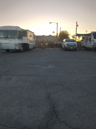 12 designated back in sites on the asphalt parking lot to the right of the building entrance. $20 a night. Water and 50 amp electric are located at the back of the RV when parked (lodge has 30 amp adapters if needed). No sewage dump on site but a pay to dump site is located at an RV park just a mile or so away across the bridge going west into California on Rt 62.