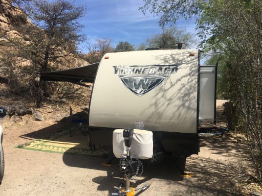 We stayed here in September and the weather was awesome. Low 90’s with clear skies. We took the dogs on the short hike to the lake and got some great pictures. The sites are fairly level and there are lots of friendly people walking their dogs around the campground. Restrooms and showers were nice. They are doing non-contact reservations, arrivals, and departures which were seamless. About 10 minute drive from the historic Downtown and Whiskey Row. Overall, a nice campground that we would visit again.