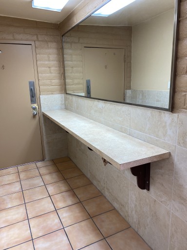 Restrooms are clean and bright... shower are big. You do need a key from the front desk for 5$ but get it back when you turn it in. The whole place is clean and very nice. Minutes away from most anything. Definitely would recommend staying