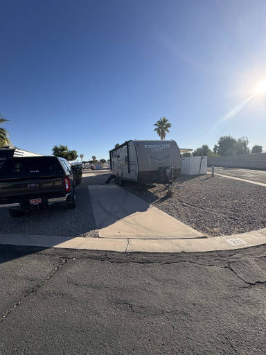 We stayed 2 nights while we visited Yuma, this is a 55+ park. Gravel back in sites with concrete patio paved streets. Full hookups, utilities are at the rear of your site. Check in was easy, someone is available to help you get backed in. Sites are a little small but workable. No WiFi but good cell service. Quite, mostly full timers but what park isn’t nowadays. Small dog park clean bathrooms and laundry. Pool and hot tub
