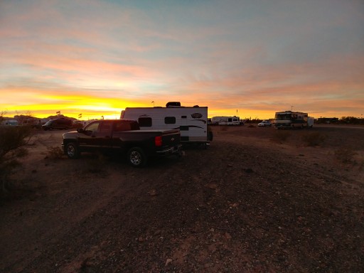 Unpaved toad suitable for RV leads to trailhead for Palm Canyon hike. Dry camping on either side of road within 100 ft of roadway (clearly marked). Campfire allowed but bring your own firewood. Mountains are stunning and you can hike anywhere. We heard coyotes on and off. Some cell phone reception. Nearest stores are in Quarzsite. Dump and water at RV Pitstop. Fresh goods at Roadrunner market. We will be back!