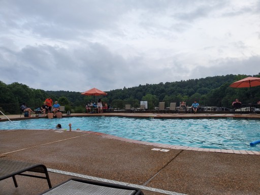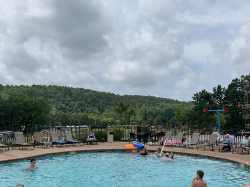 The sites are level and well-spaced from other RVs. Everything was green and ALL of the grounds were well cared for. The pool may have been one of the best at any RV park. There’s a 2 mile nature trail that goes in and out of the woods. Bathroom was clean and functional, but nothing special. The disc golf, zip lines, obstacle course and being able to rent kayacks and pontoons are a great touch! Kids will have plenty to do here.