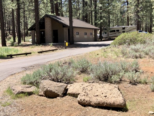 Lots of trees. Most spots will easily fit 30' or under motor home. Big fifth wheels be careful because there are a lot of trees to maneuver around. Investigate campsites prior to making reservations for long rigs. No hookups. Restrooms, trash, dumping station available. Each site has a picnic table and fire pit.