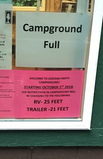 heading north this time and it was so nice, we came back. no rain and it was beautiful. no hookups but there is water and a dump. peaceful and very quiet. only about 5 miles to crescent city and only a couple more to the beach. store at hiouchi is less than a mile away and is really well stocked and also has gas and r v propane. paid $33 with senior disc.