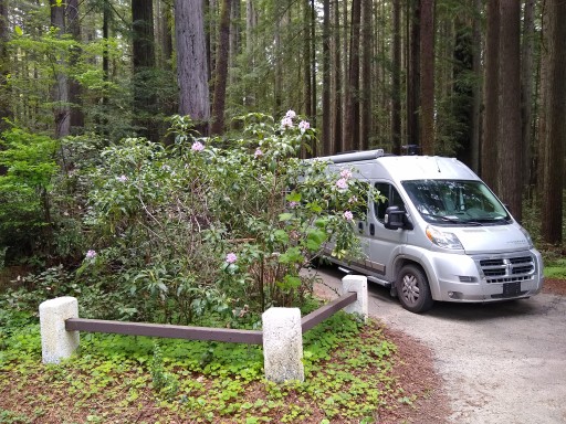 I'd say the 32-foot limit on RV length is optimistic, as some of the parking pads are small--our 20-foot RV fits nicely--and the park roads have some tight turns. No pull-through, no hook-up, no dump station. However! Water at spigots throughout the park, toilets (no showers), nice picnic tables andfirerings, a children's playground, and some strollable trails through the second-growth redwoods. Plus that delightful redwoods chill--the one that makes you sigh with relief when you escape the triple-digit heat of southern Oregon or interior California. Minutes away from Crescent City or Jedediah Smith State Park.