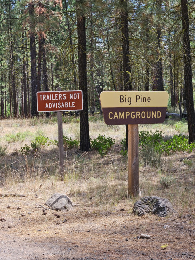 The sign discourages us from bringing trailers into this camp. The camp road is narrow between trees, but sites are long enough. Water hand pumps and vault toilets. Hat Creek runs alongside the camp and is very nice and cold.