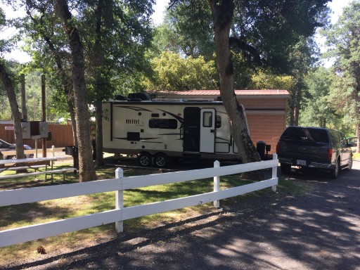 We stayed here in a 41 foot DP, towing a car. Owner was not onsite when we arrived after almost an hour of confusion, someone that was working on the property, perhaps an employee, helped direct us to our site. This place is very small and very run down. Overgrown weeds everywhere, unleveled sites and poorly maintained buildings. There were mobile homes next to the RV park that were falling apart. When we checked in, there was only one other camper so it was quiet. The sites are mostly shady with lots of big trees. It was tight getting to our site, with having to get up a slope and then moving our RV around the gravel surfaced site to attempt leveling. We didn’t use the bathrooms but my husband checked out the men’s bathroom and it was not in good condition. The roofs on several buildings were covered by blue tarps. They all needed painting and other repairs. I think someone bought this property and was fixing it up. There were some guys working on one of the buildings.