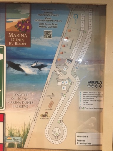 Very well designed park across the street from oceanside dunes. It's about .5 mi walk to beach area via access route (due to rehabitation of dunes). Close to Seaside and off Rt 1; near Monterey. Free wifi and cable somewhat offsets expense of stay, but this is a very expensive park imho ($80.64/night with 10% Good Sam discount applied). Clean and neat facilities. Our site was back-in, and manueverability is a bit tight, but site itself was wide with gravel base, patio, picnic table and fire-pit. If it bothers you, note that the nearby Rt 1 Hi-way noise is persistent.
