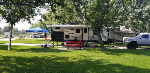 This was our first outing in the new trailer. Made reservations online which was incredibly easy. Cost was $45 a night for weekend. Both 30 and 50 amp available. Full hookups. There are 2 locations: Cottonwood (where we stayed) and Lakeside. Cottonwood has lots of green grass and trailers only. Sites are all paved. The Lakeside has more dirt and rocks and tents are allowed. Lakeside tends to get more noisy as well. Kids love the splash pad, and ride bikes or scooters all around the park. Pets are welcome. Campground is tucked away and feels like you are camping even though stores are like 3 miles away. Will definitely be coming back here again.