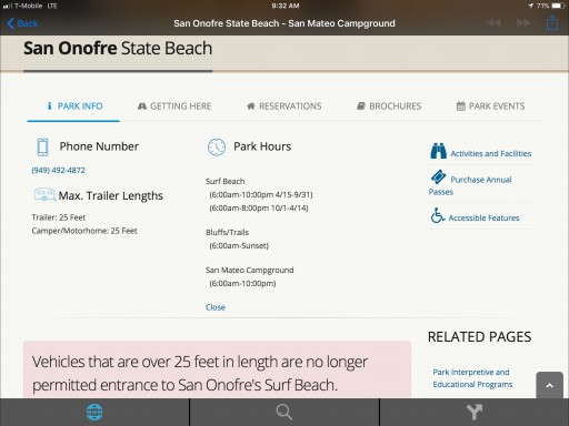I’m showing up and hope San Mateo camping won’t turn me around. The web site says 36 feet max so that is what I’m going on
