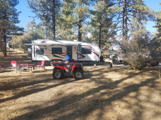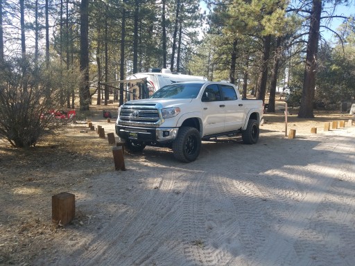 We have a 2015 powerlite 24fbxl. And a Tundra Crewmax. Stayed in site 6. Took 2hrs from San Gabriel Valley. Clean camp ground. Water connection at #5. 35* At night 70* daytime. It was an adventure once you went from the main paved road to the dirt road as you turns left. But that was half the fun getting there. We have Sprint and got good cell signal. Bring plenty of firewood. Open from May 1st - last weekend of Oct.