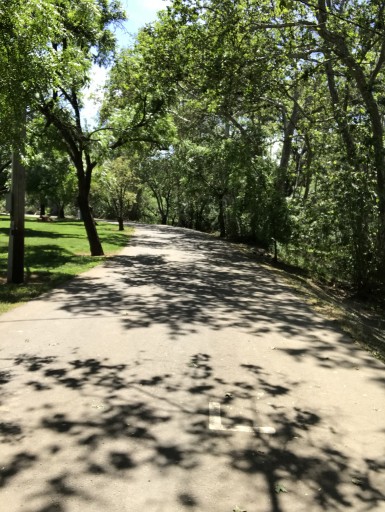 Impossible tight spaces,no dog area and mostly asphalt and craggy concrete old trees not good for pets. One way in and out of park.