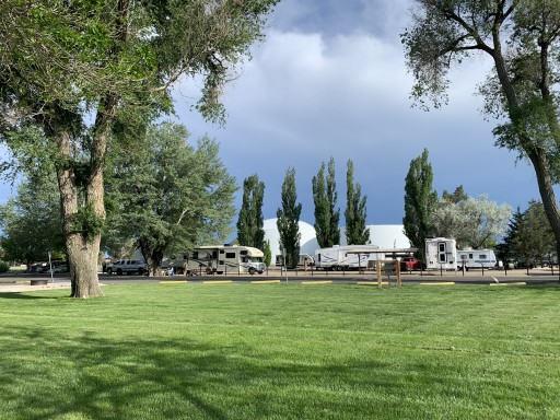 Stopped here for a quick overnight. Basically a large gravel lot with sites around the perimeter but some have electricity and there are water spigot throughout. Restrooms but we didn't use. Adjacent to fairgrounds, nice park with pond and beautiful swimming pool for $3. Clean and quiet. Definitely would stay here again.
