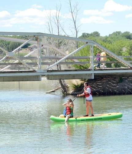 Beautiful big park. Seperate Dog runs for large or small pups with running water in the large dog area. Rv dump station. With NONpotable water. And ample rv parking. No overnight parking thou. Park does close at dusk. But a great place to stop and take a break. Theres a couple play areas for the kiddos and walking trails are everywhere. Bathrooms and covered picnic area. Theres a living history Museum and some cool attractions to see dealing with the history of the area. Giant lake for fishing or lite water sports. Great place to bring the whole family and spend the day.