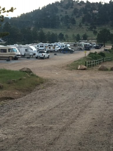 We camped here for Father's Day weekend in a RV spot without hook ups. It was nice being at the back of the property, more like being out by ourselves. However the site we were at (93) was at the bottom of the hill and it rained everyday. So all the rain, sand, and dirt came to our site. Also they have over 8 campground hosts, so every hour or so someone would be driving around checking up on things. This can be nice and a bit too much all at the same time. The campground had many rules that we were not used to, such as we couldn't put anything on the grass. So we had to take our shade tent down. The campsite were much closer than what we were used to. We could hear what neighbors were talking about, close!! The bathrooms were clean and had hot running water. Showers were 6 minutes for $2, so we passed. The area is absolutely beautiful and we loved being close to Estes Park.