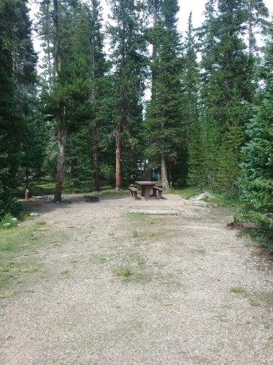 Stayed 4 nights with our 19 ft camper. The dirt road from Hwy 14 to the campground was a little rough, but we had no problems getting in. We saw several moose on the drive as well. Also there has been a lot of beetle kill in the area (but the campground had healthy trees). The sites all vary in size, but all have a picnic table and fire pit, and are pretty level. The place filled up by late Fri night, so get in early. There are no dumpsters in the campground, so plan on packing out all your trash. There are two pit toilets which were cleaned daily by the campground host. The lake is a short drive away, caught one trout (no bait fishing allowed). There are several really nice dispersed sites in the area, we would consider doing that next time to save the $18 per night fee. Overall a nice campground, doesn't feel crowded, and very peaceful.