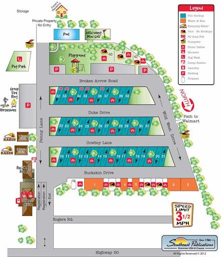 This place has a walmart and dollar store next door so you can stock up. Sites are very close together and 2 sites share each utility post. The game room was locked up. Our site had a shade tree but many don't.