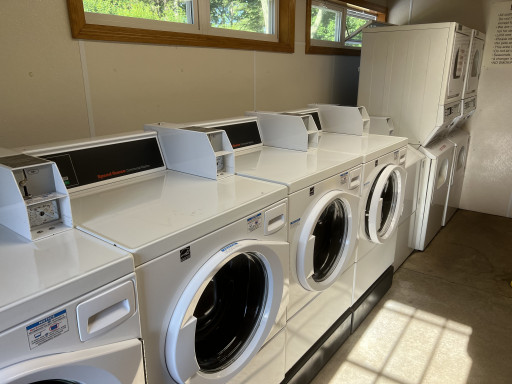Stone dust level pads for the RV with abutting cement pad for the picnic table. We had site E74 which was huge and right on the river. Hookups were nice. Playground was clean and neat. The camp is gated and they give you a card to get thru the gate. We didn't use their bathrooms and showers so I can't rate them. Two of four clothes dryers were inoperative. The camp was dog friendly and the workers were polite. We had a good time and will go back.