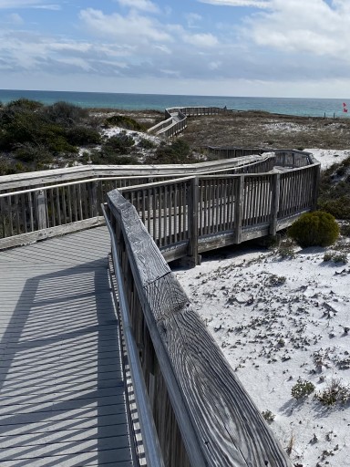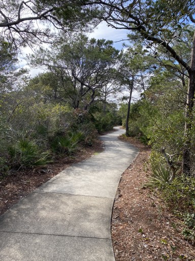 Henderson has about a mile of beach and is wedged between the beach and US-98. Gravel sites are level and oriented so that the ample vegetation between sites allows for considerable privacy. I’m guessing that the beautiful maritime forest surrounding sites reflects what the entire area looked like before development of the the nearby communities. Access to the beach is over a paved path through a low forest and boardwalk over dunes. All sites are E/W. Easy access to dump station. Bathhouses are well maintained and very clean; no paper towels though. The park is in the city of Destin near Elgin Air Force base, so expect some noise.