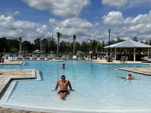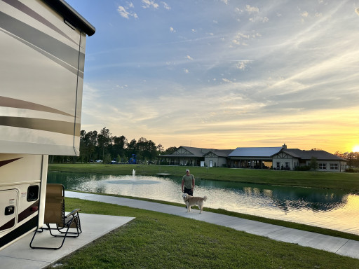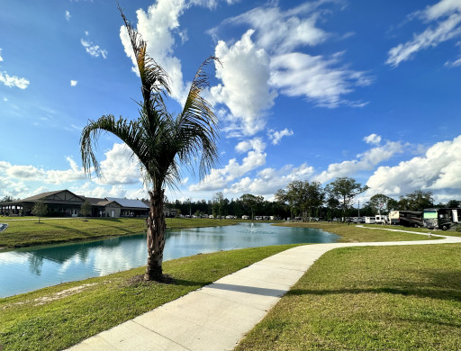 Beautiful, clean, and amenities galore! Lake, sandy Beach, pool, hot tub, restaurant, sports bar, tiki bar, putt putt, sports courts, games, playroom for kids, awesome store, activities and so much more! We loved our short time here and love that it is so conveniently located off of the interstate. This is now one of our favorite RV Resorts ever! So well planned and so much to do here. Wonderful staff, especially Mazie! We will definitely return every time we head south to Florida!