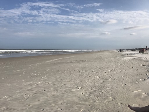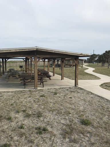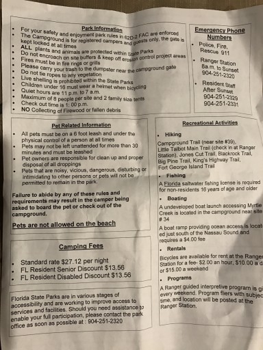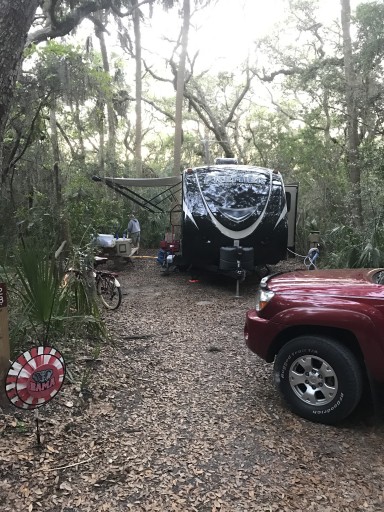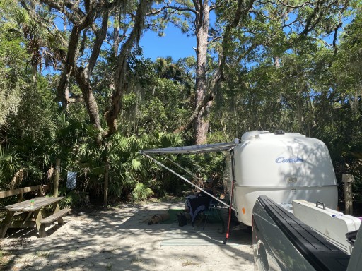 Camped in a travel trailer 23' with slide. Site 28 is tight but level. Has moveable fire ring and picnic table. Road in is narrow so watch for limbs. Gated campground with check in across A1A. Beach access also on other side but campground does have some sites next to creek with small fishing pier and boat launch. 30 and 15 amp at pole with water close by same side. Dump station and trash dumpster near gate.