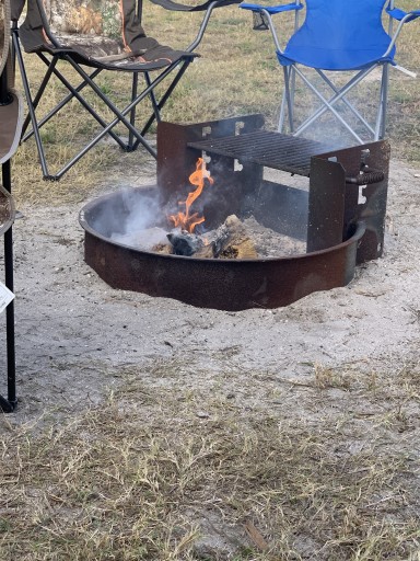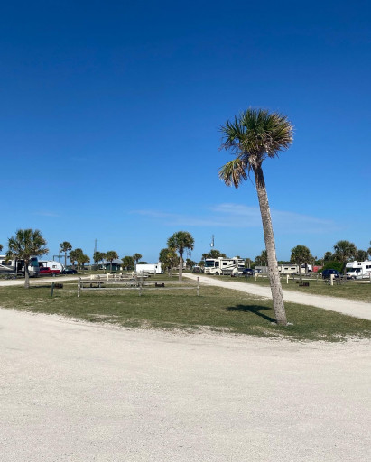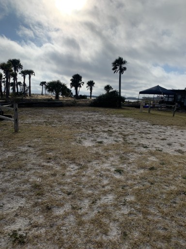 We stayed here the weekend after Thanksgiving. This small campground it is pretty neat on one side is the St. John’s with a view of the ships and the other is the inlet. At the end of the campground is a small drive on beach for 4X4s only. Great fishing. You can see the damage from the previous hurricane and rising water levels to one of the roads. Only down fall is the gates close at 11 pm if not in then locked out!!! We came from south Fl to see the Lights in St. Augustine and made it back to camp only after driving like gta with 2 mins to spare. Bathrooms and showers are clean and well kept up, sights have no shade, but that is normal for this terrain. Each sight has a fire ring with built in grill.