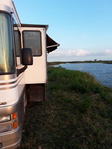 Grassy, bumpy field for parking. (Free, with permit. No hook ups)Airboats roar by somewhat frequently till around midnight. Two trash cans, a porta potty and boat ramp. 3-4 bars AT&T