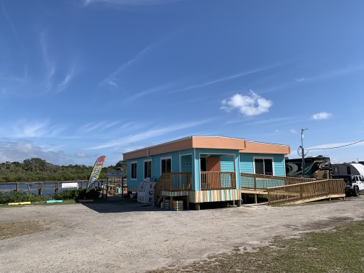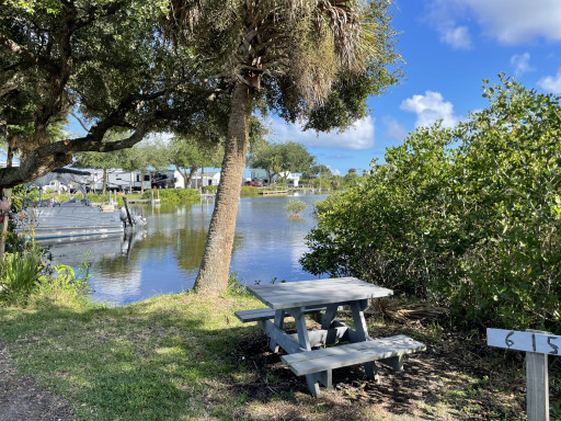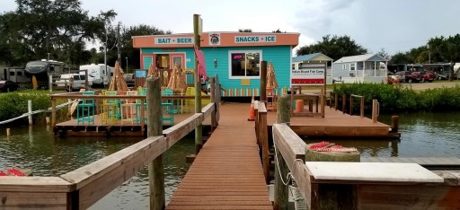 RV park is situated right on a beautiful part of the Indian river. Watch manatees and dolphins all day long on the fishing dock. Catch fish day and night on their dock. Very friendly staff with a brand new retail store with bait and tackle and groceries. Very easy to pull in and park. Close to US 1 with lots of restaurants shopping and retail stores.