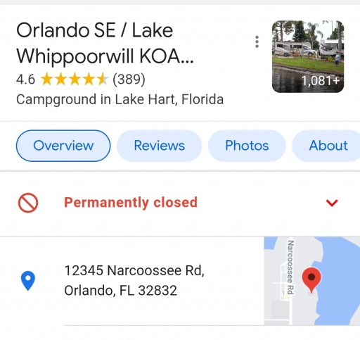 We had tire(s) problem along the Florida Turnpike near St. Cloud, so we looked for a place to camp while the tire shop ordered a new tire. Julie B. found this place in an app, Itsxone of the nicest KOA's we've ever been to! Learned that the campground will close April 1st next year to be torn down to build condominiums on the lake shore! The people that we met that work there were the friendliest around except for one who was irritated by us not having our tag with the combo to open the gate. That's the only reason I only gave them 4 stars. It wasn't any of the ladies or the 2 John's that we met. They let us stay past the checkout time so that we could get our tire(s) issue taken care of. Thanks all!