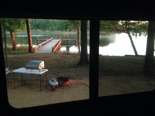 38ft class A with jeep tow. Easy into the park. Unhooked jeep just pass check in station. They warned us the road was rough on the way in ( since 2019) so three stars. The road in was rough with holes and some gravel but drivable. Saw 3 sites that are flat and long enough for a large rig. Site 22 is the best and the ones on either side will work. A 2 night stop over for us. It rained on our rest day so we stayed in. Park is well kept. One cell bar, ATT. Too many trees for satellite. Nice lake area with small boat launch. Dogs enjoyed walking around.