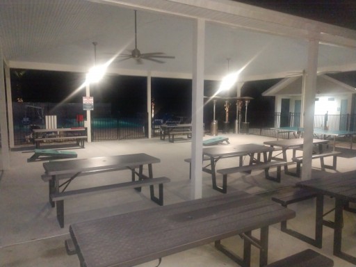 Covered pavilion with corn hole and ping pong. Heated swimming pool and clubhouse. They had smores on Friday night and breakfast brunch on Saturday at the clubhouse.