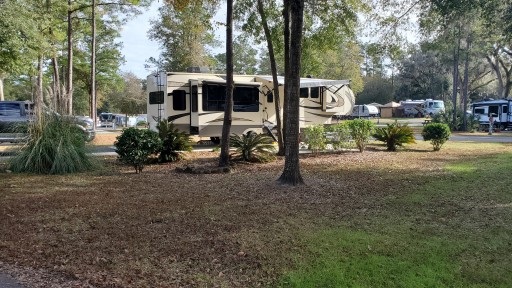 The dirt roads in from the gate to the campsites are full of terrible potholes and ruts. You cannot go faster than idle or you’ll trash your coaches interior. The pull through sites are all dirt, and the other sites have grass, but some no sewer. Power hookups were great, WiFi was good too and so was water pressure. Charcoal grills at every site and areas for fires too.