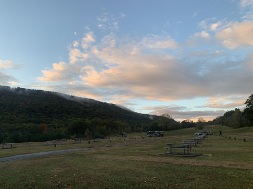 We stayed 8 nights. I believe the leaves were at peak color, very beautiful and it’s only about 8 miles from our granddaughter. It worked great for us. We had 2 days of rain and the campground road has a lot of potholes and got muddy. The dump station is awkwardly located, but it works. The bathrooms are not working. The trash is too far to walk to, all the way back out of the campground and down the road. That worked for us because we tow a car. There is a disk golf course and that is used a lot , cool to watch. My T-Mobile had one bar, but I had service. The T-Mobile Wi-Fi worked fine, husbands Straight talk had good service. Campground has Wi-Fi. I withheld a star for muddy potholes, a large pile of rubble, tree limbs that scrape down the side of the motor home, trash so far away, and low water pressure. We used our pump to boost it so it was fine for us.
